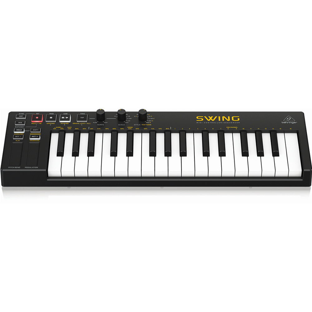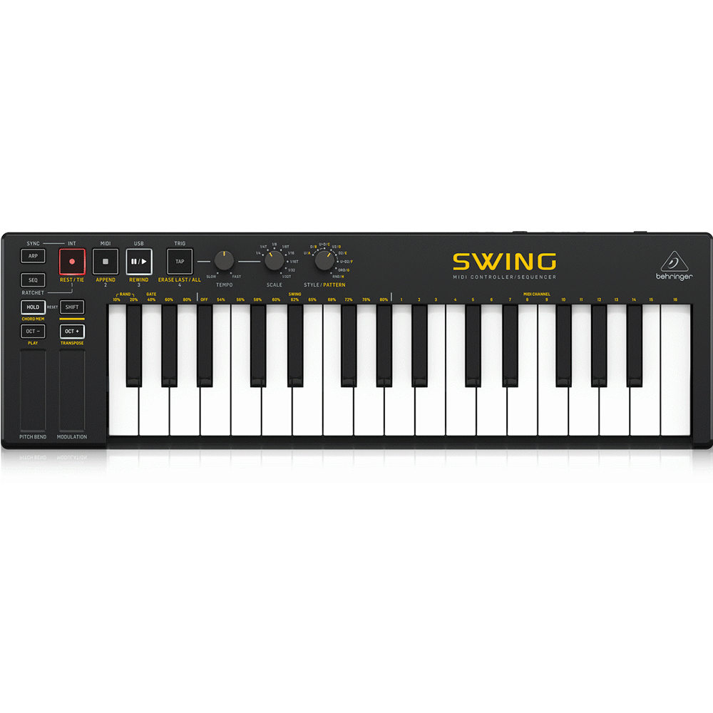 The Behringer SWING gives you full control over any synthesizer or virtual instrument in your DAW via USB or MIDI. Featuring a 64-step sequencer with an 8-note polyphonic sequence combined with 32 compact-sized keys and pitch and modulation touch-strips provide unlimited ways to express yourself in a compact and portable package