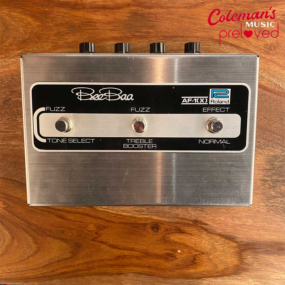 A true relic from the golden era of Japanese pedal design, the Roland Bee Baa AF-100 is as bold and bizarre as its name suggests. Released in the early 1970s, this iconic fuzz and treble booster combo was in production from around 1972 to 1979, long before the Boss brand took over Roland’s effects game. With its unmistakable three-footswitch layout, aggressive fuzz tones, and instantly recognisable enclosure, the Bee Baa remains one of the most collectible pedals of its era.