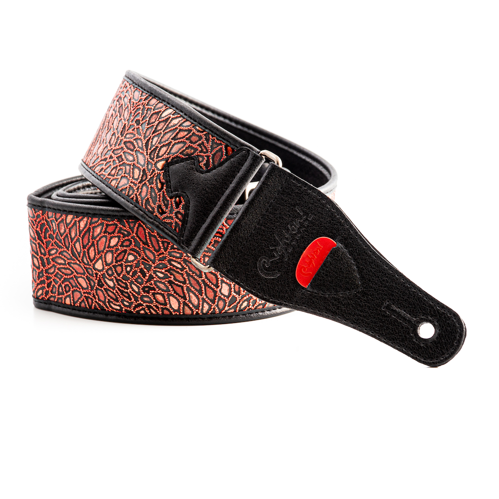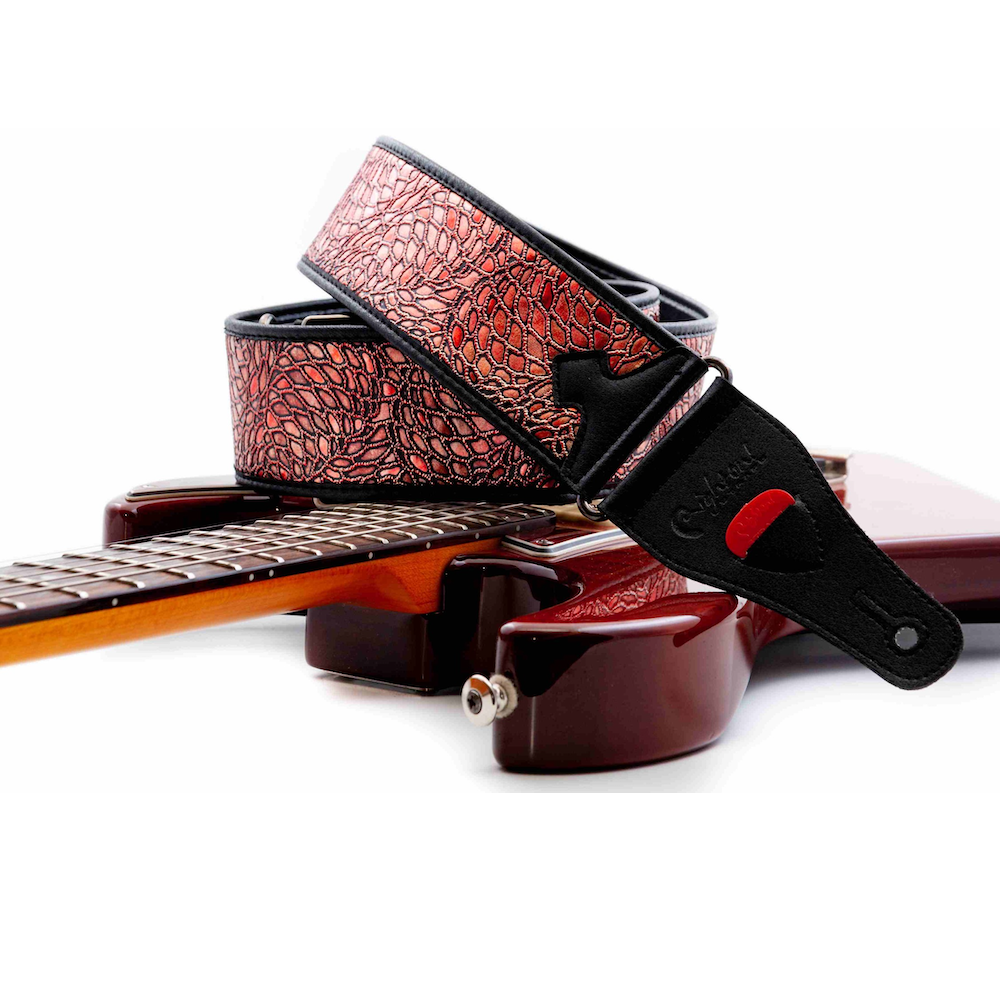 The Alien Red strap is one of the most eye-catching designs in the Right On! range — and it’s not just the name that’s otherworldly. With its shimmering surface, rich burgundy and red tones, and subtle glitter finish, this strap catches the light in all the right ways and adds a futuristic flair to any guitar or bass.